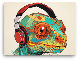 Vibrant Chameleon with Headphones Illustration Canvas Wall Art