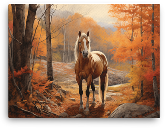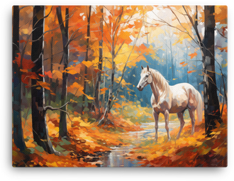 Let a noble white horse thunder through autumn's kaleidoscope—this White Horse Amidst Fall Foliage canvas wall art brings bold, nature-inspired energy to any room. Artwork style: Realistic, painterly portrayal of...