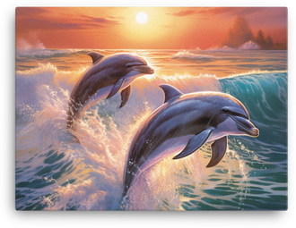 Sunset Dolphins Leap Canvas Wall Art bursts with oceanic whimsy—the dolphins arc through a radiant sunset, delivering a bold, playful vibe that instantly elevates any room. Crafted on acid-free, PH-neutral...