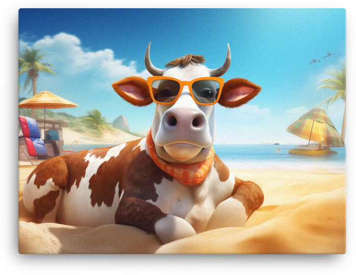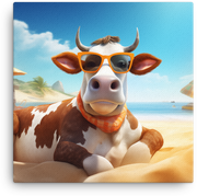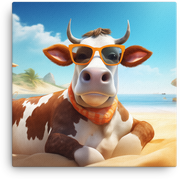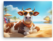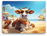 Beachside Bovine Bliss: where sun-kissed surf meets playful charm, this canvas wall art dives into coastal whimsy with a cheeky barnyard vibe that instantly livens any space.