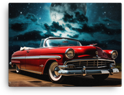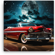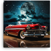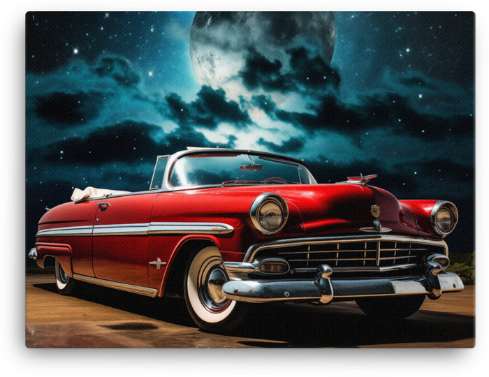 This canvas print features a vintage car bathed in lunar light against a deep, dreamy night sky, a splash of chrome and color that instantly commands attention.