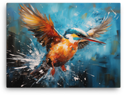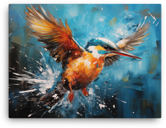 Catch your eye with Dynamic Kingfisher Splash Canvas Wall Art—a fearless kingfisher gliding through a vibrant splash of tropical blues and sunny orange, crafted for Visual Funky fans who crave bold, creative vibes.