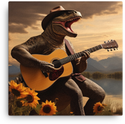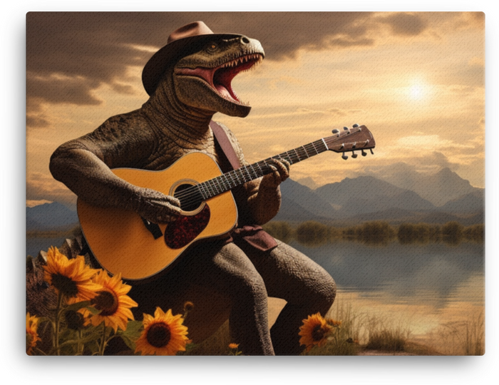 Meet the Visual Funky centerpiece: Guitar-Playing Dinosaur at Sunset Canvas Wall Art, a guitar-playing dinosaur basking in a sunset, ready to jam in your space.