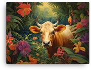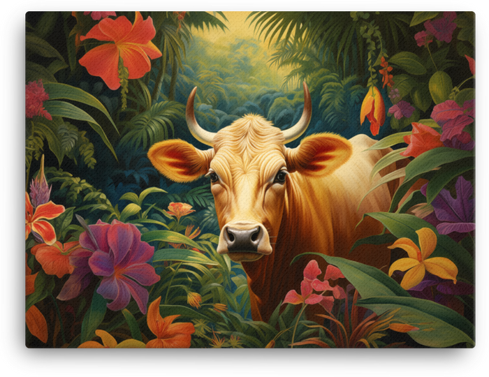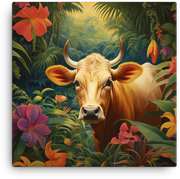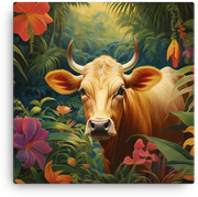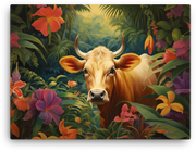 Immerse your space in a wild fusion of jungle magic and cow-chic whimsy with Jungle Oasis Cow Canvas Wall Art.