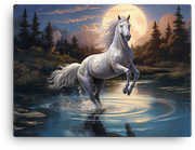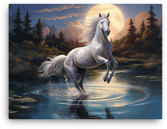 Moonlit Ripples White Horse Canvas Wall Art sweeps across your wall with moonlit glow and ripples of light trailing a white horse, blending fantasy with serene drama. This captivating canvas print is a must-have centerpiece for a room craving Visual Funky flair.