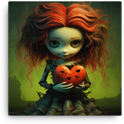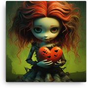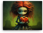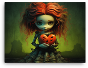 Red-Haired Doll Holding a Heart on Dark Fantasy Background Canvas Wall Art