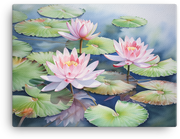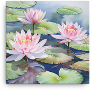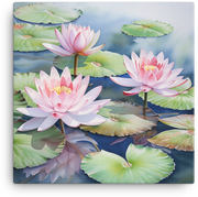 This canvas wall art showcases a calm water lily scene rendered in vivid, fade-resistant print on an acid-free, PH-neutral poly-cotton base. The 20.5 mil canvas is hand-stretched over solid wood stretcher bars and finished with a matte coating for depth and longevity.