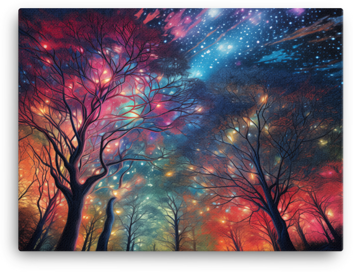 Let your walls breathe with a celestial canopy as stars peek through a whispering forest—Starlit Sky Through Forest Trees Canvas Wall Art, a bold Visual Funky statement that sparks imagination and conversation.