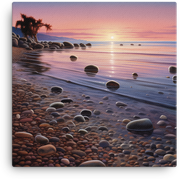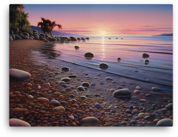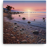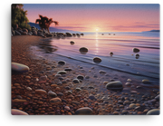 - Canvas wall art with fade-resistant print in a tranquil coastal sunset and pebble beach scene