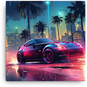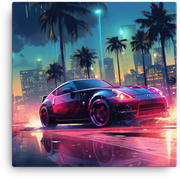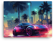 Tropical Neon Nights invites you to cruise through a neon-soaked cityscape where a vibrant car glides beneath electric palm trees—a bold, kinetic scene that injects energy into any room.
