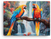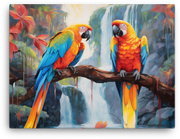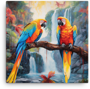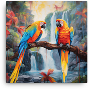 Immerse your space in a tropical pulse of color with the Tropical Parrot Pair Waterfall Oasis canvas wall art—a vibrant duet of emerald greens, sunlit yellows, and coral accents that shimmer where a cascading waterfall meets jungle light.